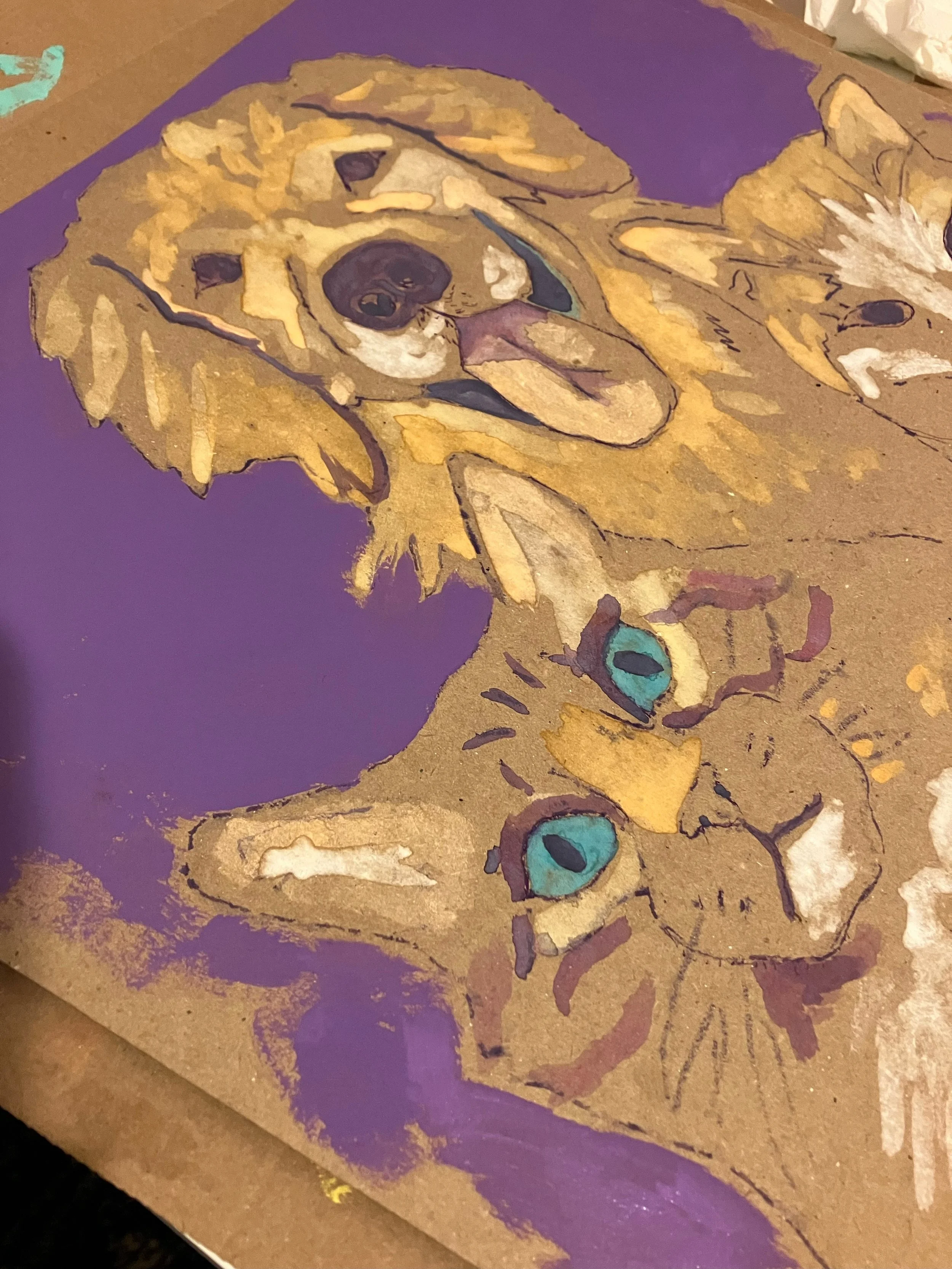 These are the two reference photos I mainly worked off of for Stewie and Sparkle. If you commission a portrait with me, you will need to provide at least one front facing well lit photo (of each pet). Below are some quick work in progress photos I took on my phone of my painting process.